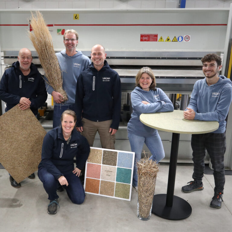Waarom brengen jullie de productie niet onder bij bestaande producenten? Wel, er zijn in Nederland geen vezelplaatproducenten meer die volgens een droge techniek persen. Deze industrie zijn we kwijtgeraakt, net als de textielindustrie. We brengen de kennis in vezelplaatproductie weer terug naar Nederland. Samenwerken met boeren en bouwers is essentieel.